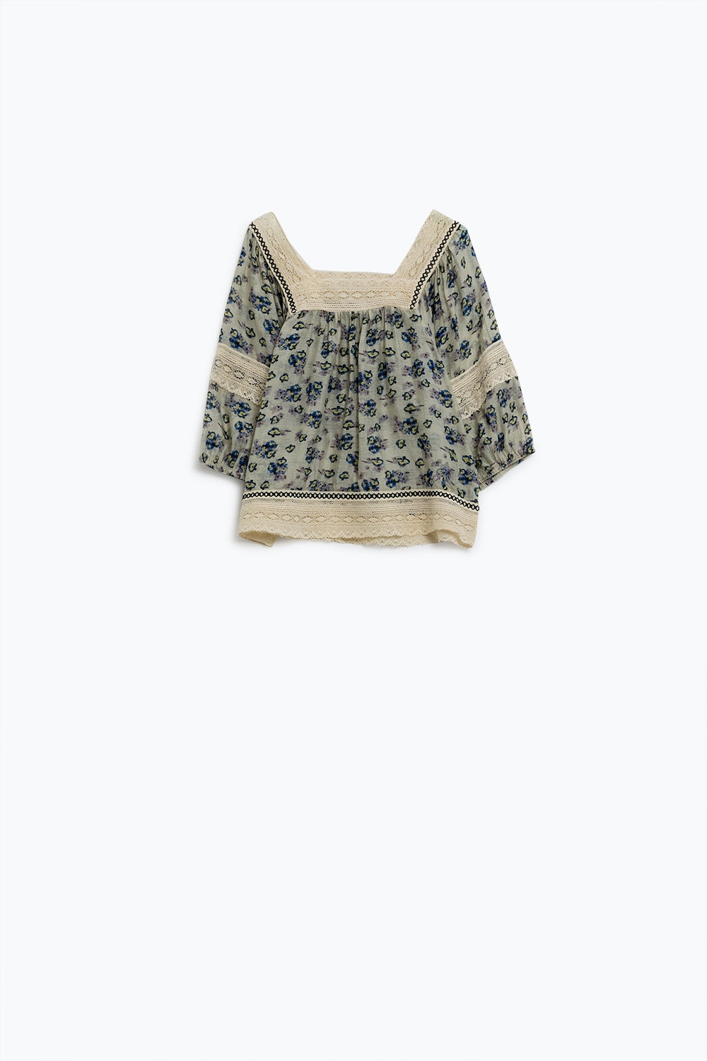 Ce chemisier présente une encolure carrée et des manches trois-quarts.
