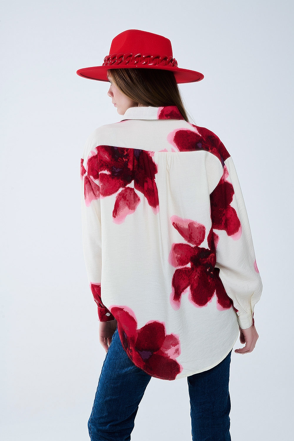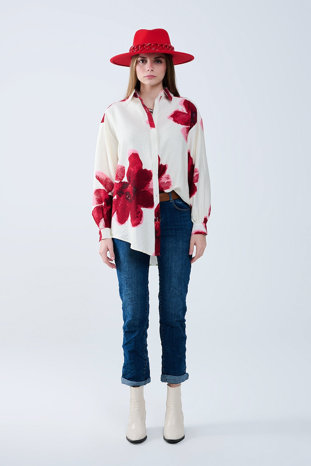 Chemise décontractée en beige avec imprimé de fleurs tropicales en rouge