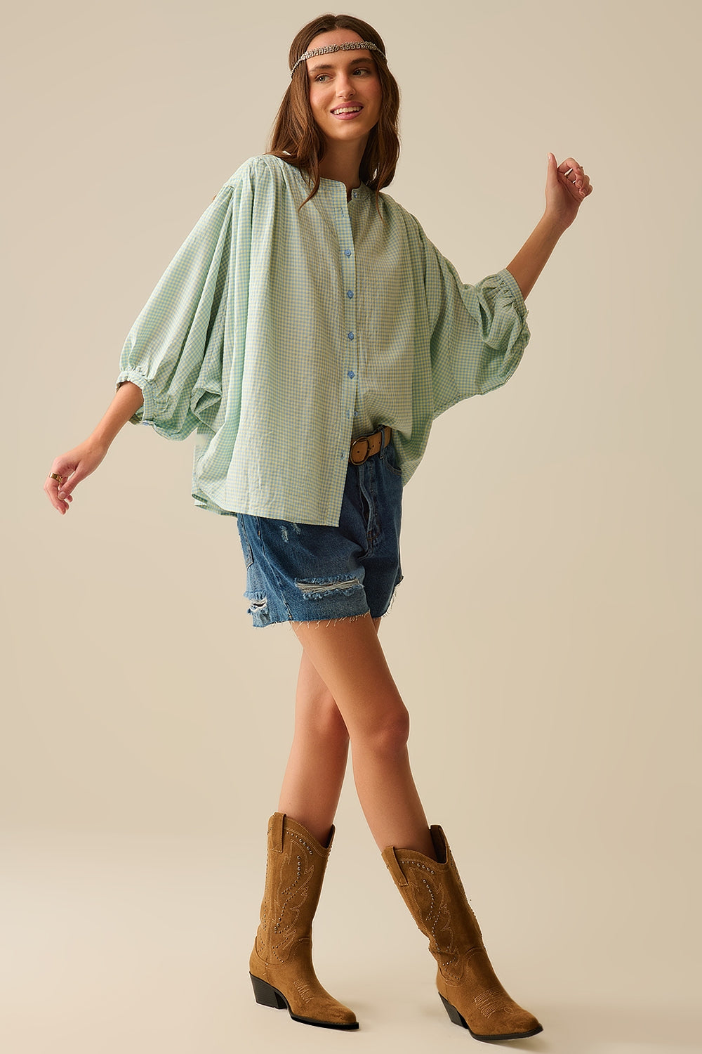 Cette adorable et romantique blouse ample en carreaux vichy bleu clair a des manches chauve-souris élégantes et une charmante fermeture boutonnée.