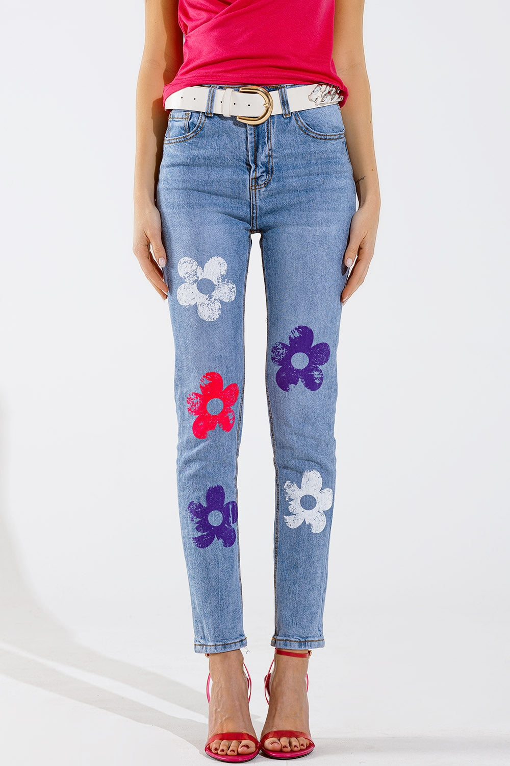 Jean skinny délavé à taille haute avec fleurs multicolores et fermeture éclair