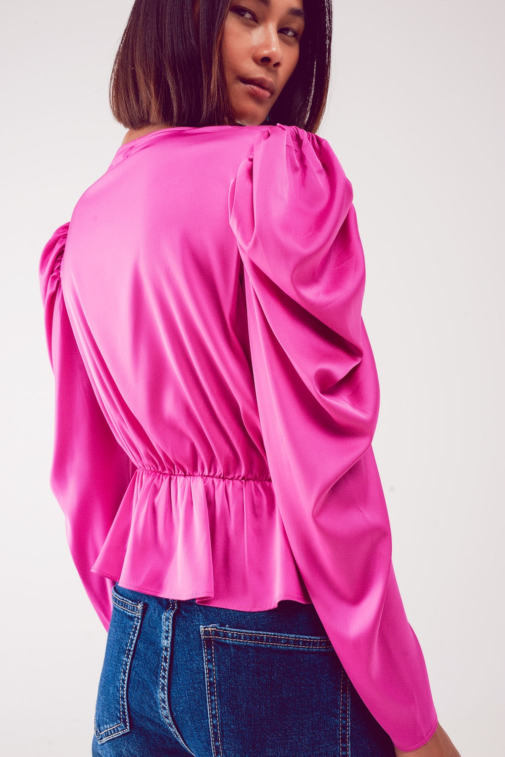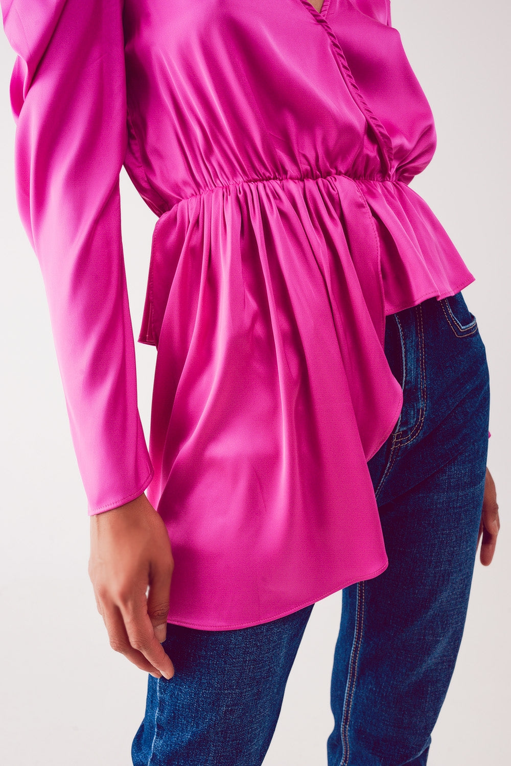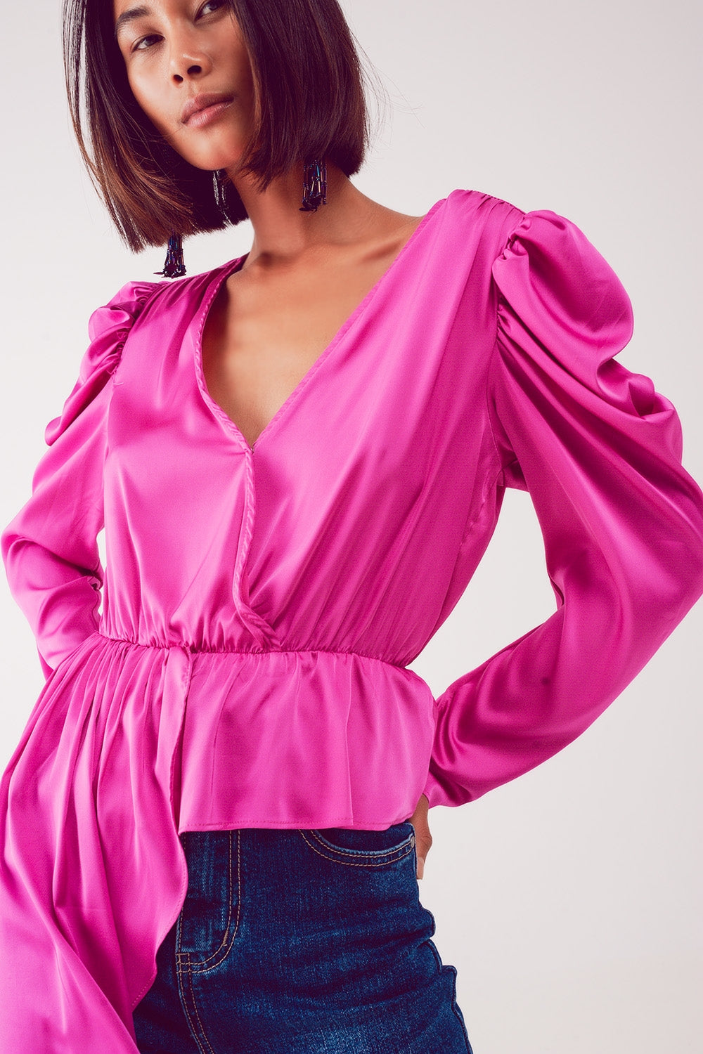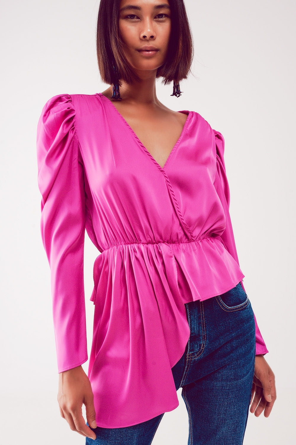 Cette blouse asymétrique en fuchsia présente une longueur asymétrique et une encoure en V, ainsi que des manches froncées volumineuses.