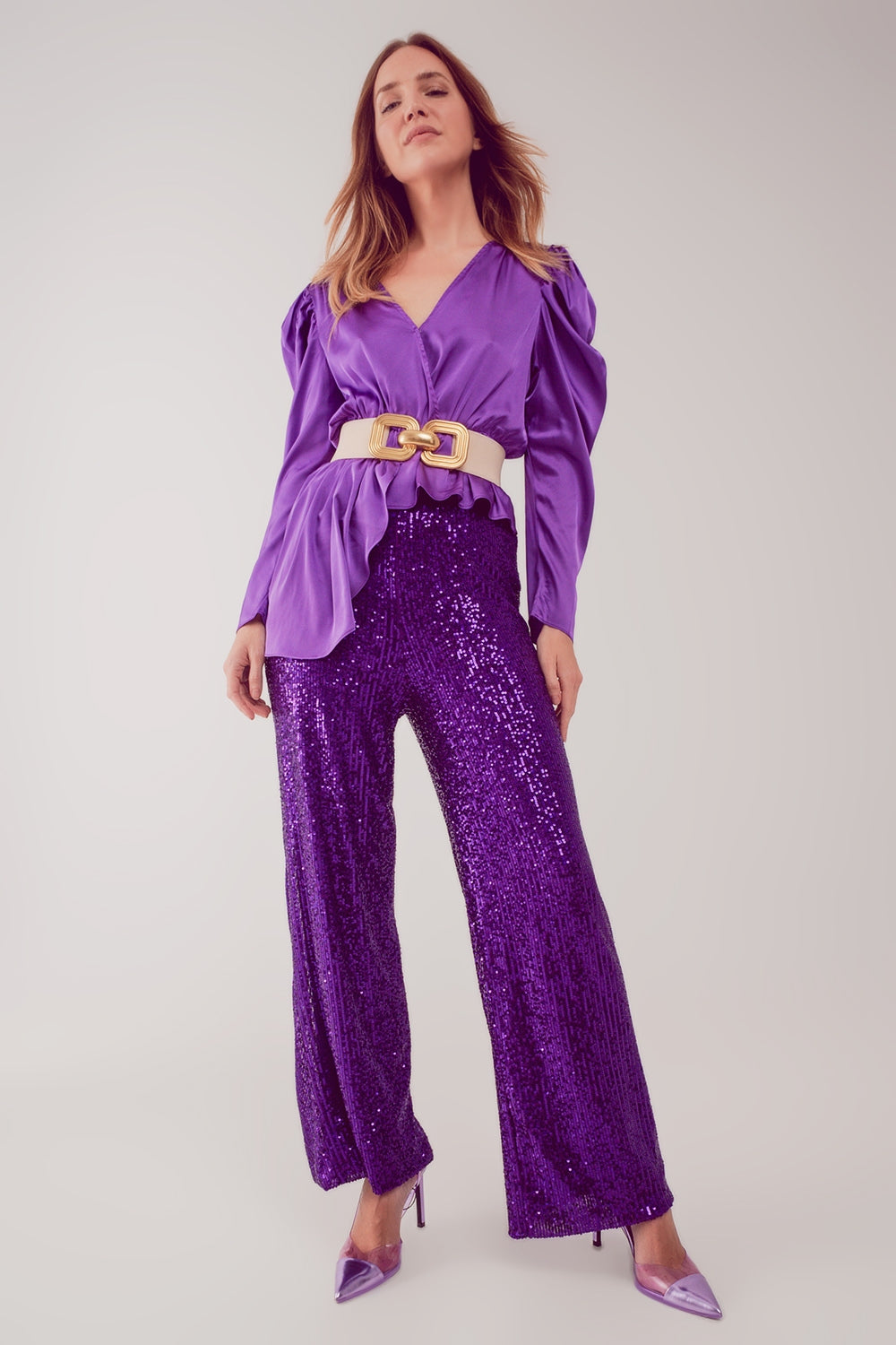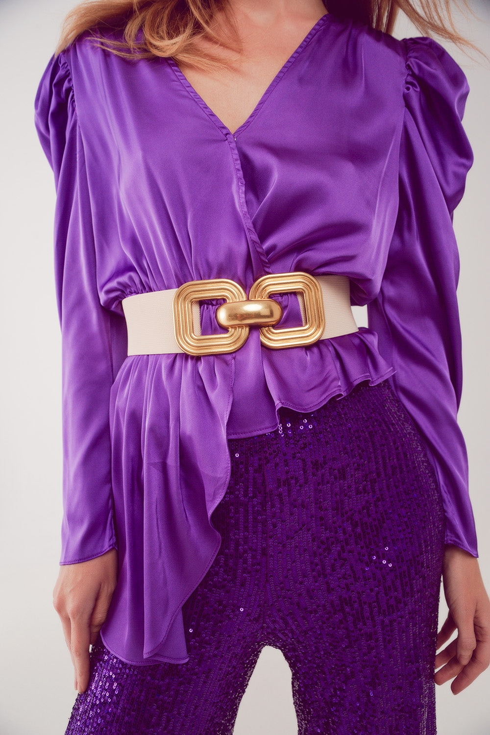 Cette blouse asymétrique en violet présente une longueur asymétrique et un encolure en V, ainsi que des manches froncées volumineuses.