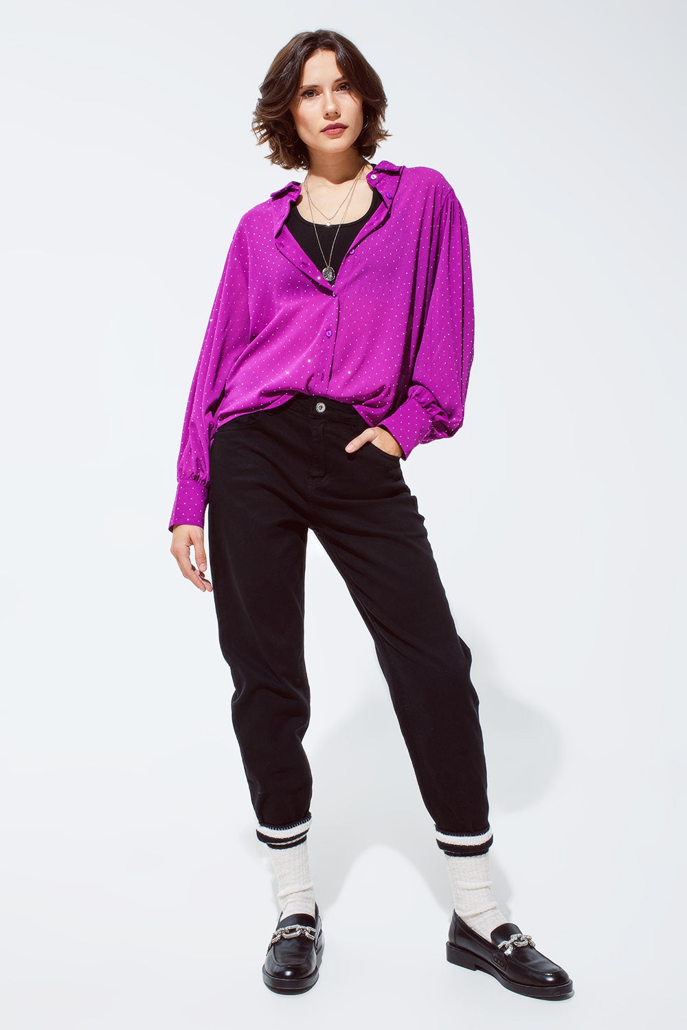 Découvrez notre blouse magenta avec détail strass, une pièce chic et flatteuse qui ajoute une touche de sophistication à n'importe quelle tenue.