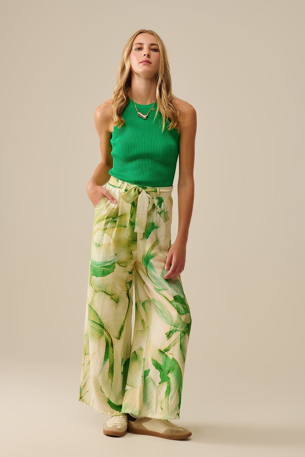 "Pantalon à jambes larges avec imprimé aquarelle vert" disponible en boutique