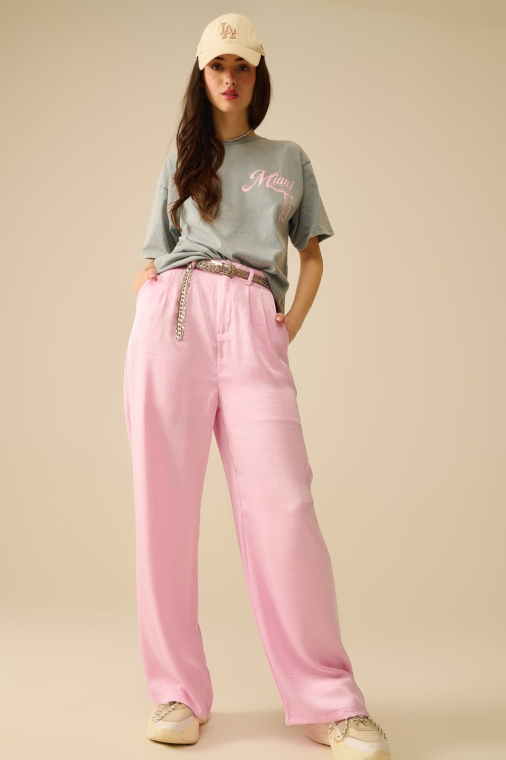 T-shirt gris avec logo Miami imprimé en rose