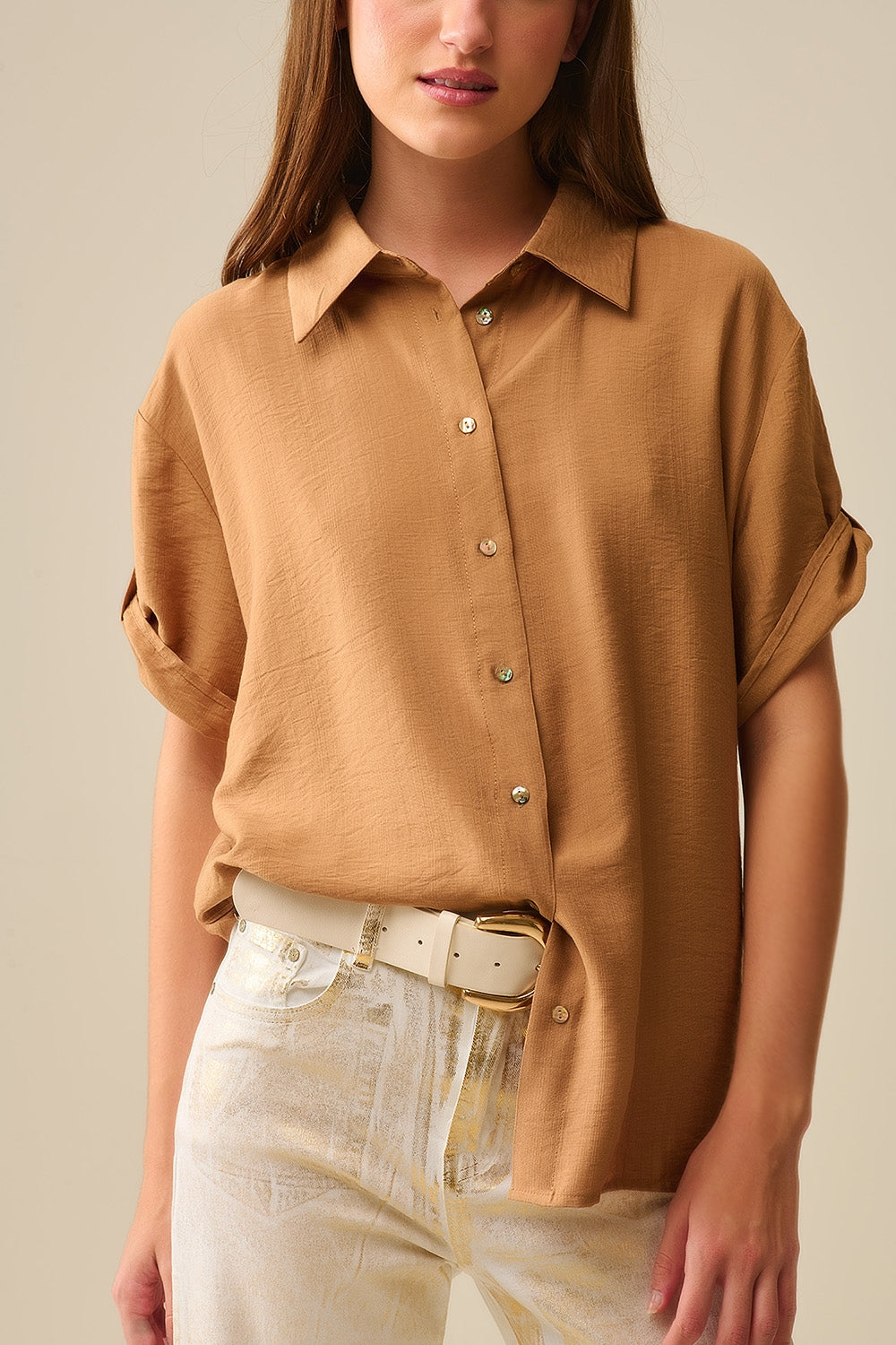 Chemise décontractée à manches courtes et boutons dorés coloris camel